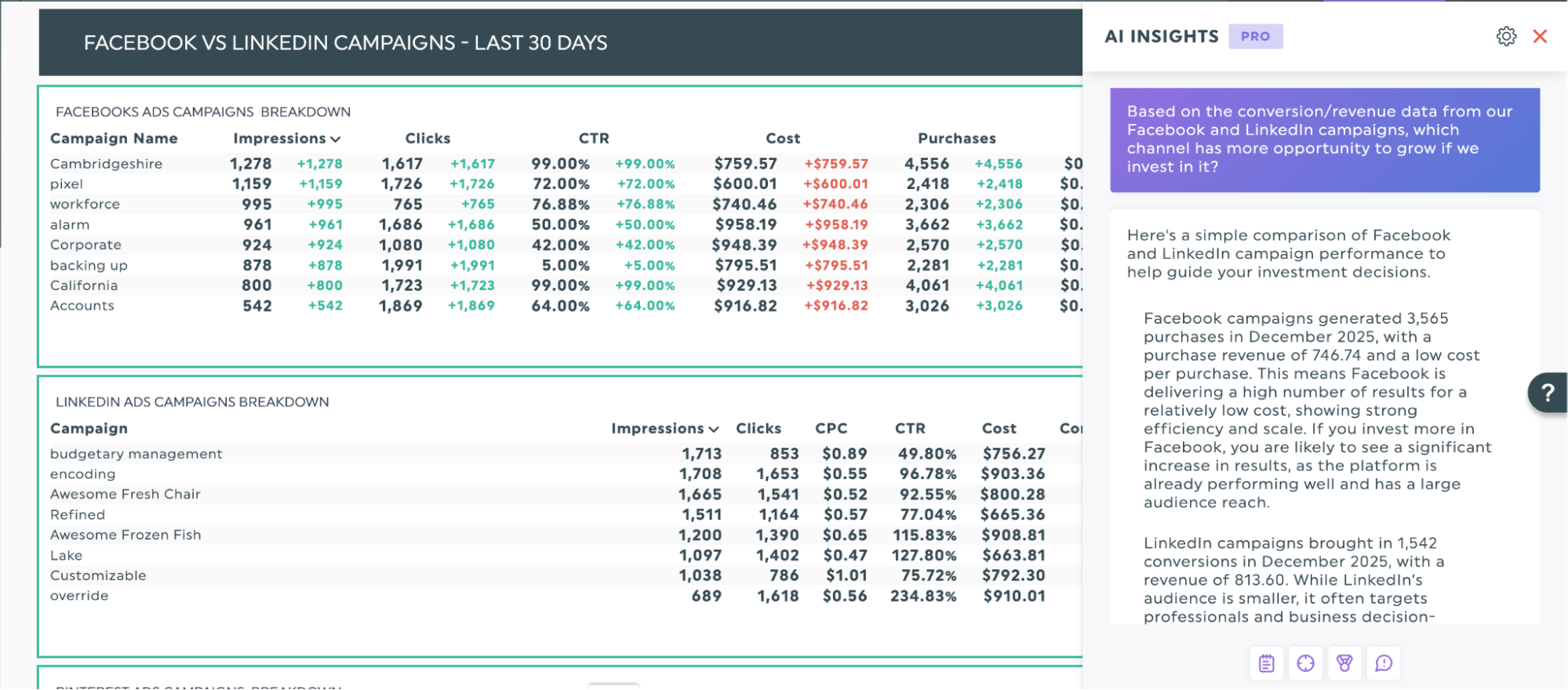 Let’s say you’re comparing conversion data from Facebook ads and LinkedIn campaigns. Our AI can give practical guidance on a single point of comparison, like conversion and revenue data for specific channels.